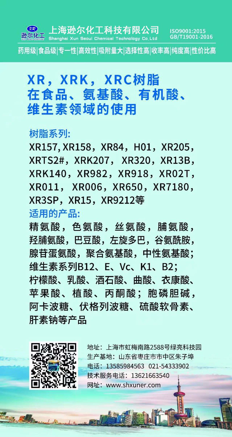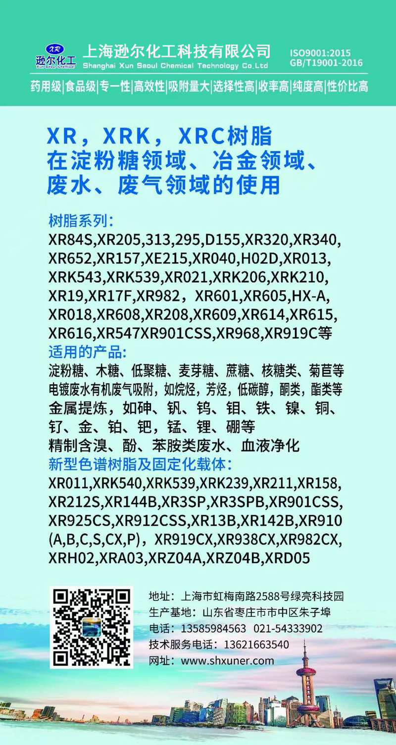 上海遜爾化工科技有限公司是上海市新型的高分子材料研發(fā)、生產(chǎn)、應用相結合的高科技公司。公司具有完善的自主知識產(chǎn)權創(chuàng)新體系,與華東理工大學,江南大學,浙江工業(yè)大學等科研應用平臺合作從事離子交換與吸附樹脂研制、生產(chǎn)和生物醫(yī)藥合成與分離工藝,三廢處理工藝開發(fā)設計工作。